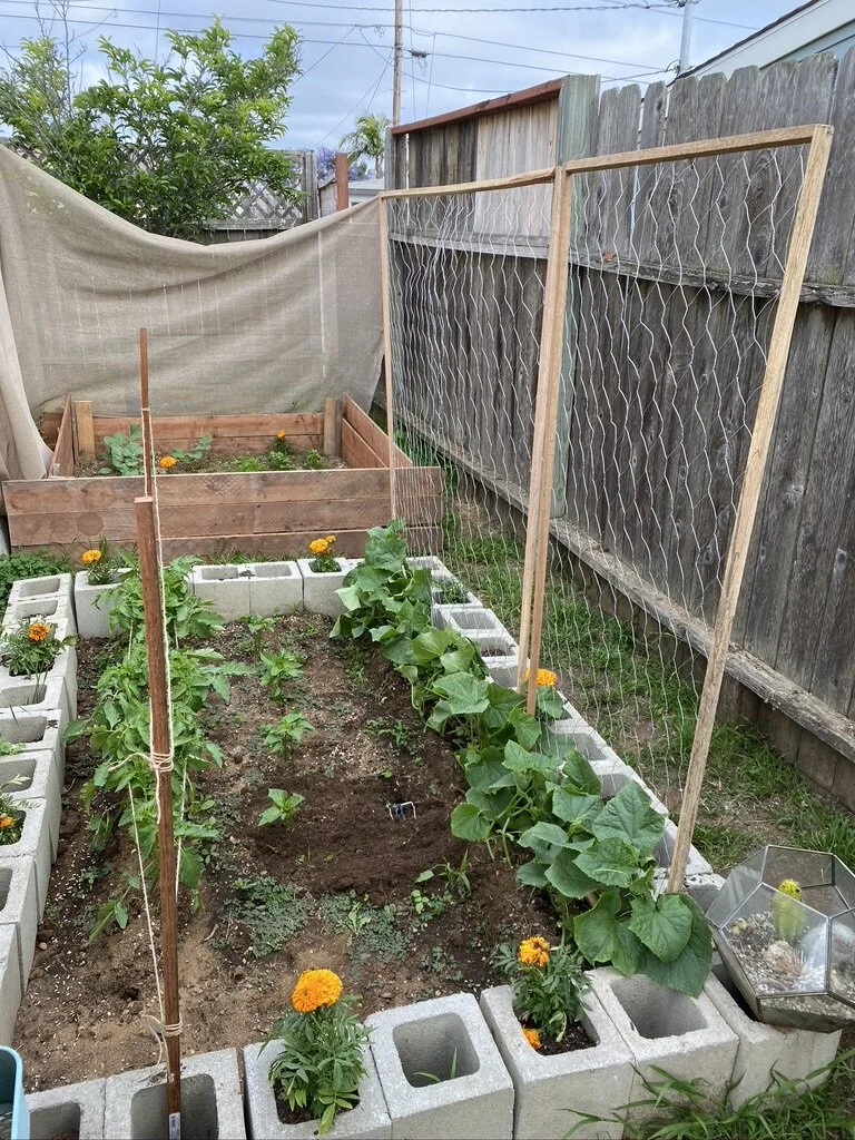 I depotted and cleaned up all the succulents that were worth saving and collected them all for a succulent garden in my front yard. So the vegetable garden adventure was under way! I already had my plants growing from seed in a seed starting tray. As they started to grow I started to clear the space! I cleared out the tables and boards, dug up the soil and started laying out where I wanted the garden beds to go. I decided to be resourceful and use whatever materials I already had there for the beds. One I made out of cinder blocks and the other was made out of old fence wood.